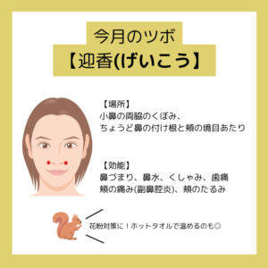 鼻の症状にはまず迎香!というくらい、花粉症やアレルギー鼻炎の方におススメなツボです!