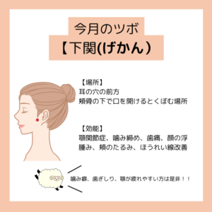 4月の営業日のご案内です ■4月の営業日 5(日)、11日(土)、18(土)、26(日)、27(月) 🔸4/19(日) 15:00、4/20(月)①10:00~ ②14:00~ 上記日時に関しましては、2025年12月までに施術をお受けいただいたことのある方のご自宅にもお伺いが可能です🙌 ※多少時間が左右することがございます。 ☯️今月のツボ☯️ 【下関(げかん)】 場所:耳の穴の前方。頬骨の下で口を開けるとくぼむ場所 効能:顎関節症、噛み締め、歯痛、顔の浮腫み、頬のたるみ、ほうれい線改善春は退職入職を始め、異動など環境が変わる季節です。 知らず知らずのうちに噛み締めてしまうことも。 朝起きたら顎が疲れている…!なんてことはありませんか? そんな時に下関がオススメです。 押しながらゆっくり口を開け閉めしてみてください 少しずつ顎の緊張が取れますよ! 美容にも良いので、朝のお化粧前にもぜひ!